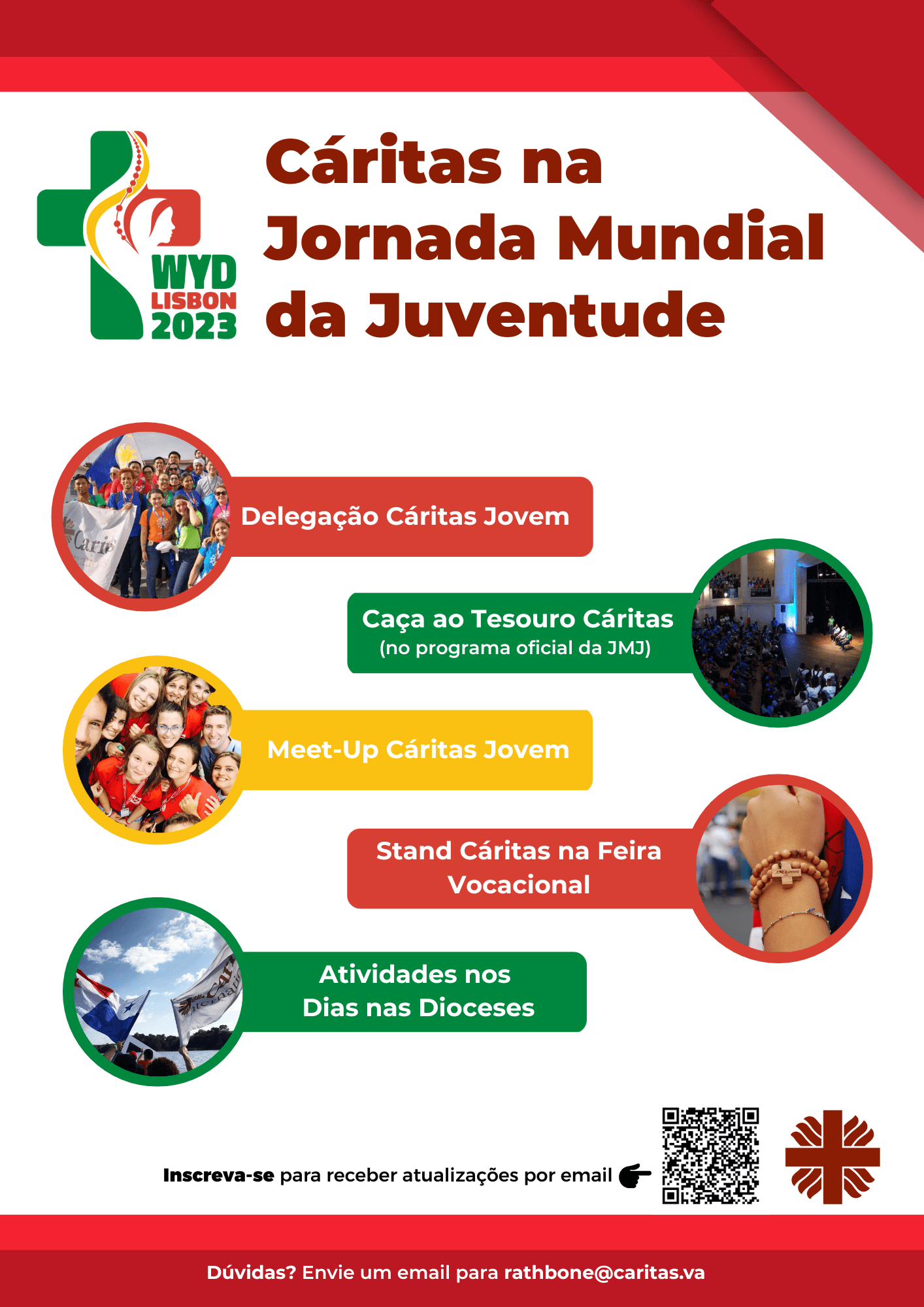 A Jornada Mundial da Juventude (JMJ) é um dos maiores eventos religiosos do mundo, que reúne jovens de diferentes países para celebrar a fé e fortalecer os laços fraternos. Em 2023, a cidade de Lisboa é a escolhida para anfitriã desse encontro. A Cáritas estará presente de forma ativa e significativa, para fazer desta manifestação de fé também uma oportunidade, para que peregrinos do mundo inteiro conheçam o seu trabalho e a sua missão.